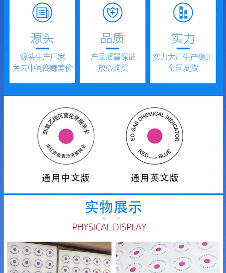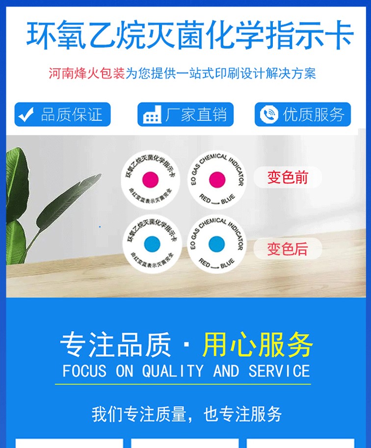 产品详情product details环氧乙烷灭菌指示标签采用不干胶贴片形式,标签上印有热敏化学材料,既可以放入物品包装内使用,也可贴于灭菌包表面,在所要求的灭菌条件下指示色标颜色由红色变成蓝色,灭菌后的颜色不易褪色。